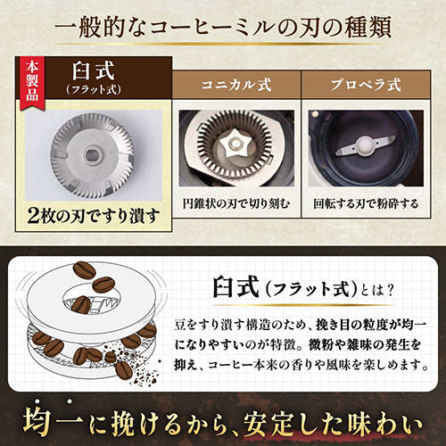 本製品は臼式(フラット式)の刃を採用。