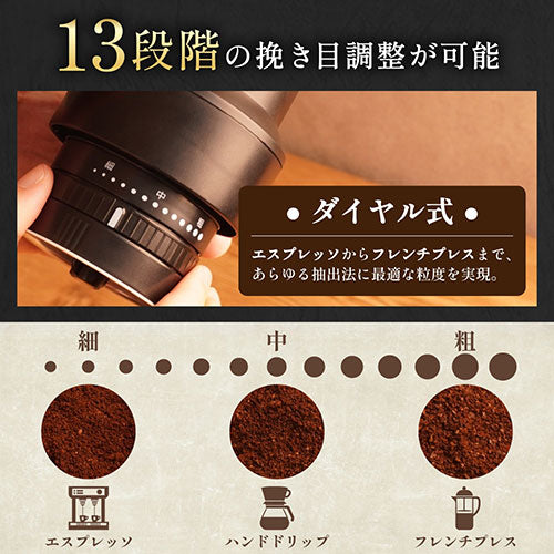 13段階の挽き目調整が可能なため、エスプレッソからフレンチプレスまで、さまざまな抽出方法に合わせた挽き方ができます。