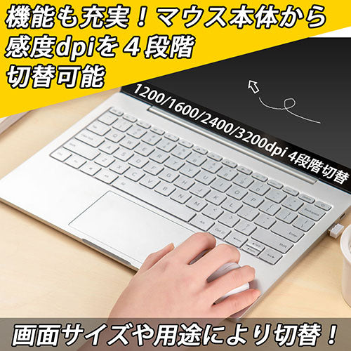 人間工学に基づいた今までにない画期的な形状!抜群のフィット感と手に熱がこもらず指がこわばらない、指先で動かす疲れ知らずのコンパクトマウス。小さくて軽く何処にでも持ち出せ、静音設計で可動範囲もノートパソコン上に収まります。速度調整のDPIも本体で4段階切り替え可能、接続は2.4GhzワイヤレスかBluetoothの2方式から選択、このマウスを使うともう他には戻れません!
