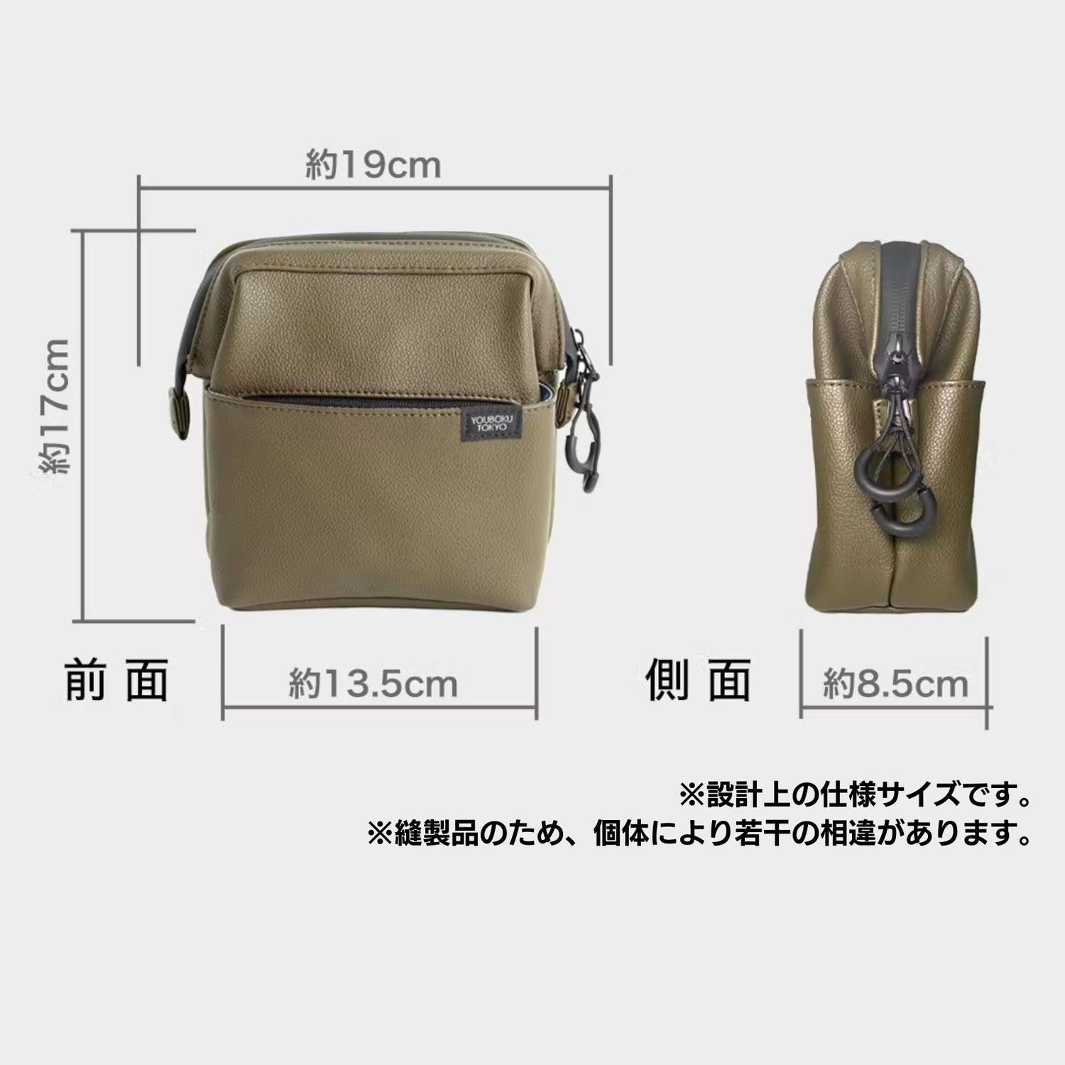 ポーチ本体サイズ:縦約17cm × 横約19cm(底部約13.5cm) × 厚み約8.5cm